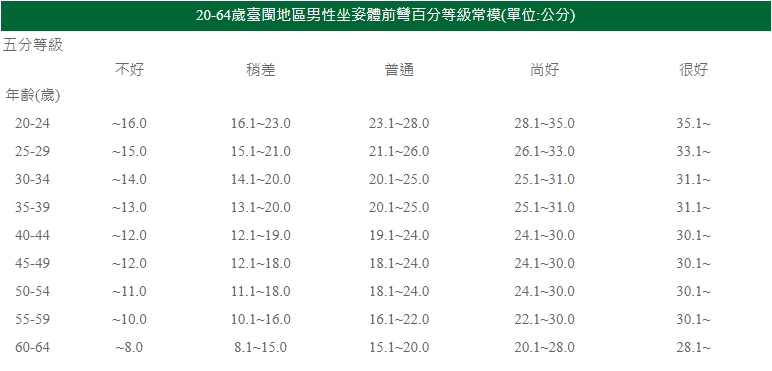 下圖為各年齡層坐姿體前彎的柔軟度分級